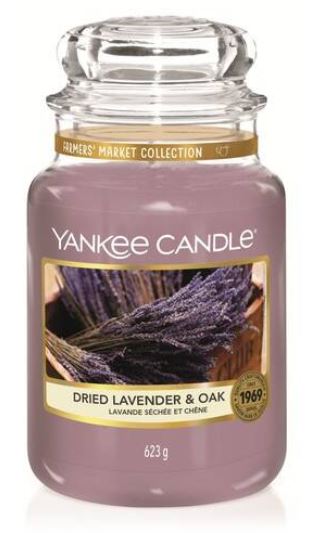 Yankee Candle Dried Lavender & Oak geurkaars in een grote glazen pot. De geur van handgebonden trossen lavendel vermengd met de bosachtige geuren en kruiden van een boerenmarkt in de open lucht.