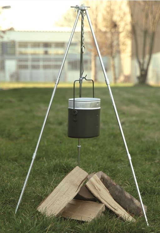 Kleine driepoot om een pan of Dutch Oven boven een kampvuur te hangen. Elk van de drie pootjes is driedelig, daardoor gemakkelijk en compact mee te nemen in het meegeleverde foedraal.