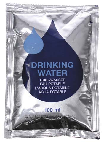 Drinkwater in pouch. Zeer lang houdbaar. Kan een paar graden vorst hebben.