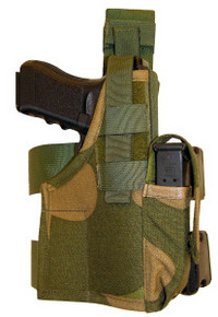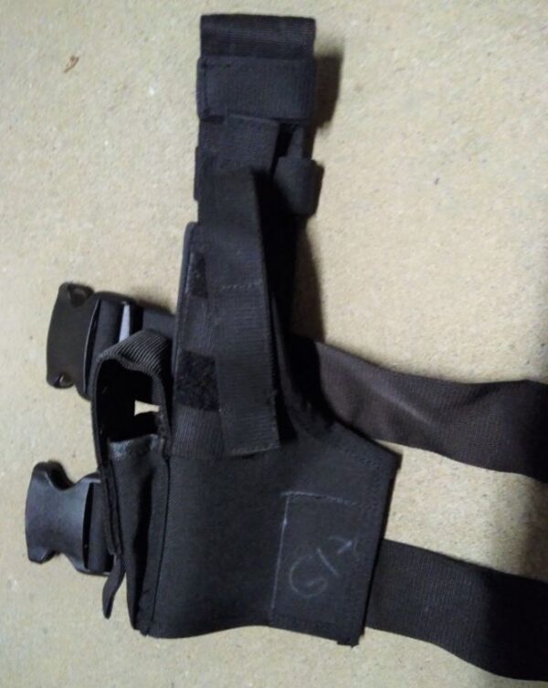 Linkshandig drop leg (dijbeen) holster. Je hangt het holster aan broekriem of koppel. De hoogte is verstelbaar en je hebt geen last van draagsysteem, assaultvest of scherfwerend vest. Wanneer je het holster even wilt afleggen kun je het snel losklikken. Een elastische band sluit met een steekgesp om het dijbeen. Voorzien van een magazijntas.