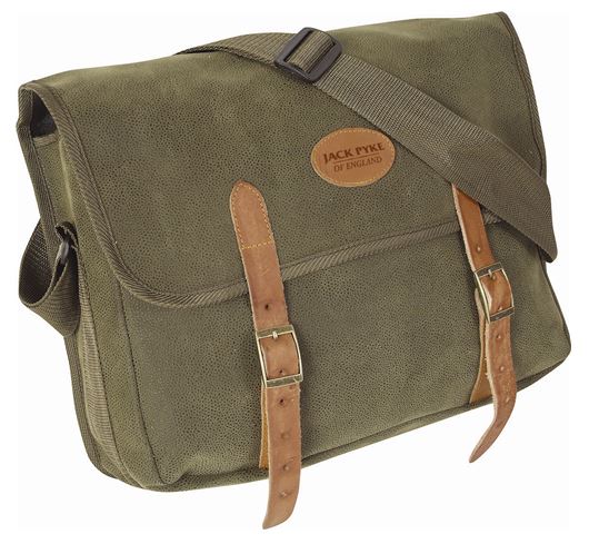Dummytas van sterk Duotex van Jack Pyke. Leren riemen met koperen gespen. Verstelbare schouderband (max. 128cm). Afmeting: 30x40x10cm.