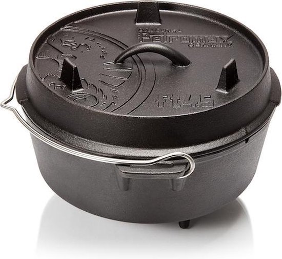 Petromax Dutch Oven 4,5 QT. Dit is een handige tussenmaat Dutch Oven, geschikt voor 2 tot 5 personen. De inhoud van de 4,5 qt is zo’n 4L (maximaal plm. 5,2L). Het deksel kan omgekeerd als bakplaat gebruikt worden. Petromax gietijzeren Dutch Ovens zijn voorbereid (pre-seasoned), dus klaar voor gebruik.