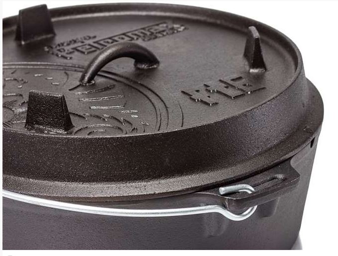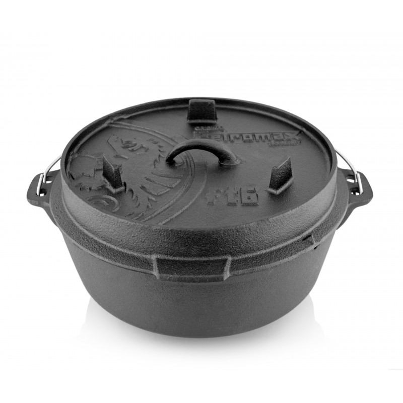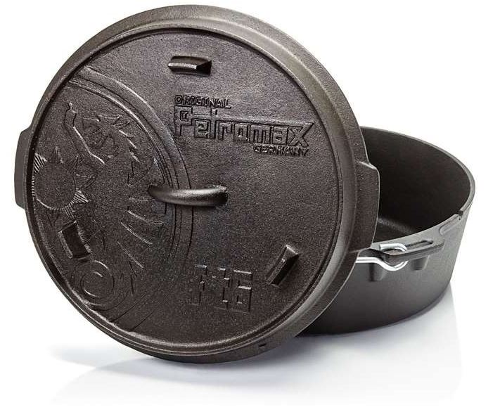 Petromax Dutch Oven ft6. Voedsel smaakt op de een of andere manier veel lekkerder wanneer het in een gietijzeren Dutch Oven is bereid. Of dat nou hangend boven een kampvuur is, of liggend tussen gloeiend houtskool, of in de keuken gebeurt. Op het deksel kunnen hete houtskoolbriketten gelegd worden, maar het deksel kan ook op zichzelf gebruikt worden. Er zitten steuntjes op die ook dienst doen wanneer u twee of meer dutch ovens wilt stapelen. Reeds voorbehandeld, dus kan direct gebruikt worden. Inhoud 6qt. = ca. 7,6 L.