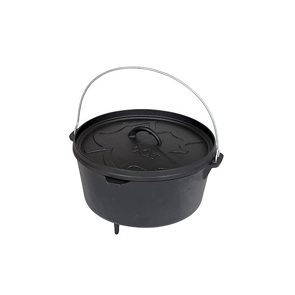 Gietijzeren Dutch Oven op pootjes om te koken boven de grillschaal of rechtstreeks in het vuur. Gietijzer houdt de warmte lang vast, zodat je gerechten lang warm blijven. Kan ook gebruikt worden als ‘dutch oven’ met houtskool op het deksel.