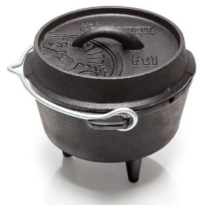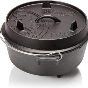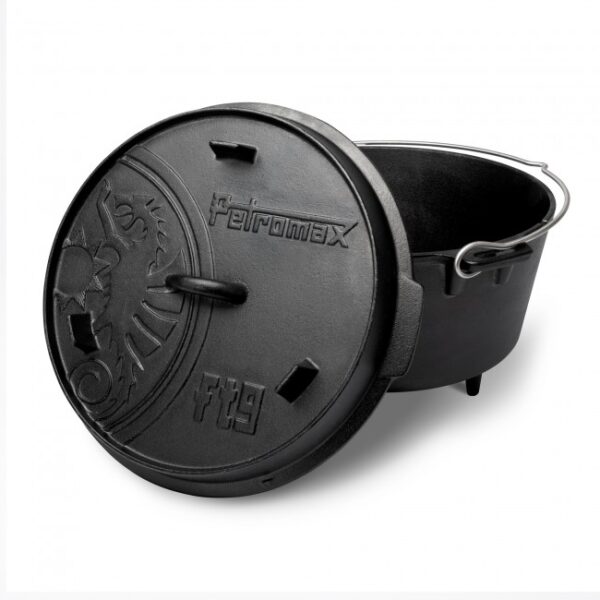 Petromax Dutch Oven ft6. Voedsel smaakt op de een of andere manier veel lekkerder wanneer het in een gietijzeren Dutch Oven is bereid. Of dat nou hangend boven een kampvuur is, of liggend tussen gloeiend houtskool, of in de keuken gebeurt. Op het deksel kunnen hete houtskoolbriketten gelegd worden, maar het deksel kan ook op zichzelf gebruikt worden. Er zitten steuntjes op die ook dienst doen wanneer u twee of meer dutch ovens wilt stapelen. Reeds voorbehandeld, dus kan direct gebruikt worden. Inhoud 9qt. = ca. 10 L.