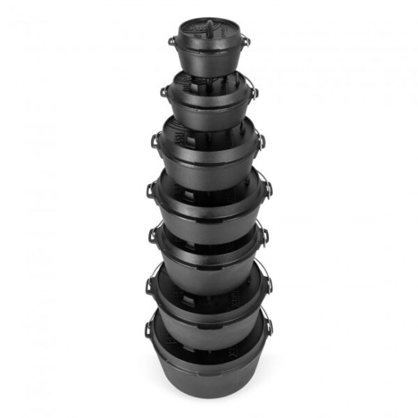 Dankzij de verbazingwekkende eigenschappen van gietijzer en de speciale structuur van het oppervlak wordt warmte efficiënt opgeslagen en verdeeld. Door het voorbehandelde oppervlak (gekruide afwerking) is de stevige pan direct te gebruiken. In de open lucht wordt het gebruikt op open vuur of met houtskool en briketten. De opstaande rand van het deksel maakt het mogelijk om sintels of houtskool ook op de Dutch oven te plaatsen. De Dutch Oven wordt hierdoor van alle kanten verwarmd en is bijvoorbeeld geschikt voor het bakken van brood.