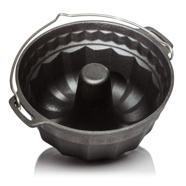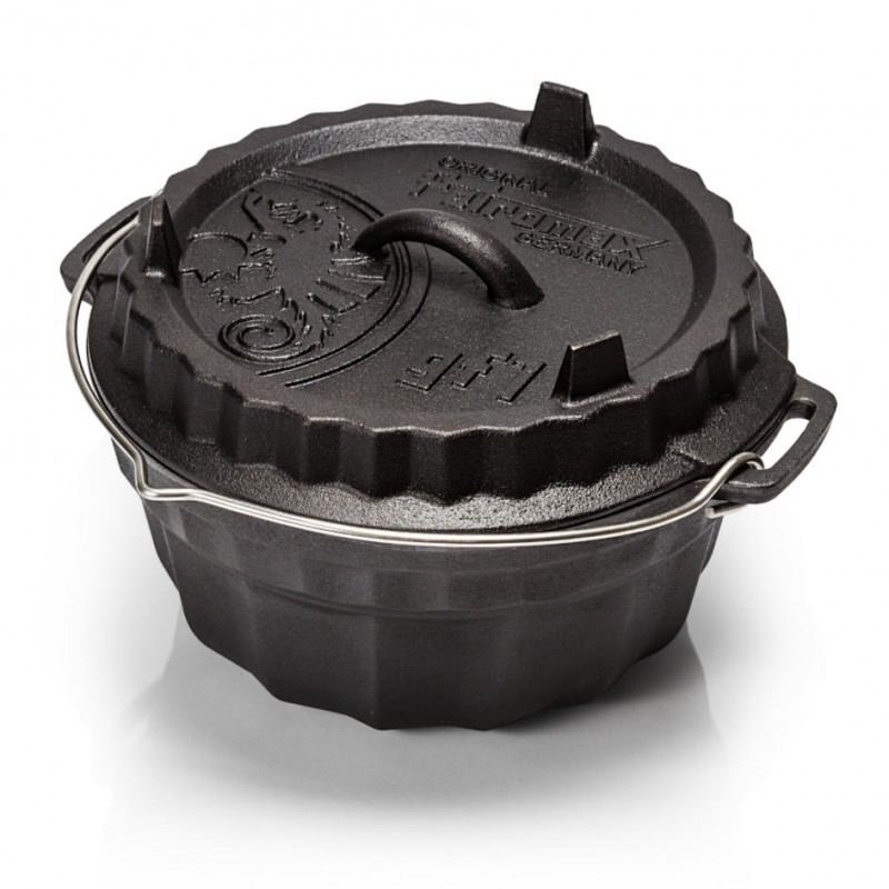 Petromax Dutch Oven pan met tulband vorm. Een gespecialiseerde Dutch Oven voor het bakken van een tulband, cake, brood, enz. Ook het deksel kan, omgedraaid, gebruikt worden om in te bakken.