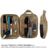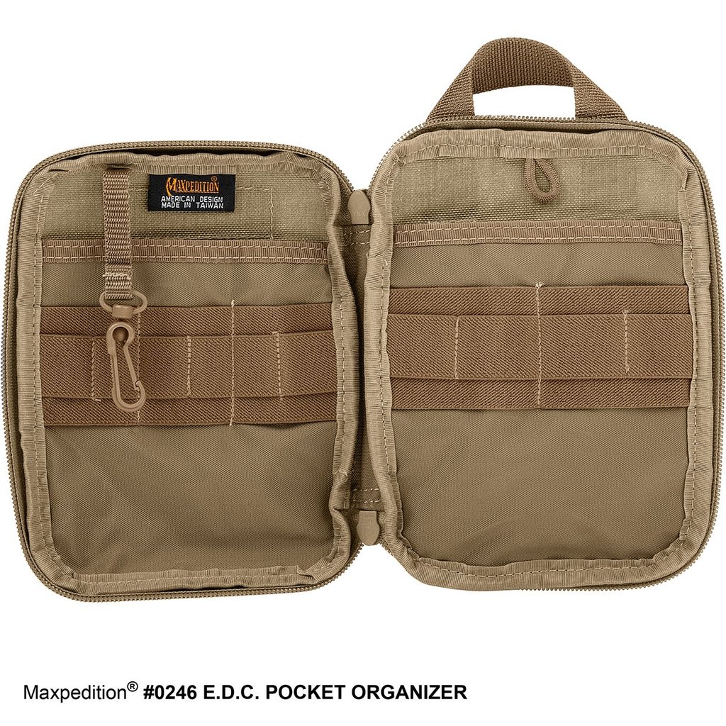 Maxpedition E.D.C. POCKET ORGANIZER. Deze pocket organizer schept orde in de dijbeenzakken van gevechtsbroeken , trekkinbroeken en workers. Zo kunt u pennen, GSM, kompas, zaklamp, mes, tool, notitieblok, enz. efficient opbergen. Op de voorkant een velcro strip voor emblemen, naamlint, e.d. Op de achterkant PALS, binnenin veel elastische lussen. Kan aan de broekriem gedragen worden, en met TacTie’s aan elk ander MOLLE systeem.