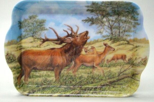 Handig klein melamine dienblaadje met een burlend edelhert. Nat afneembaar.