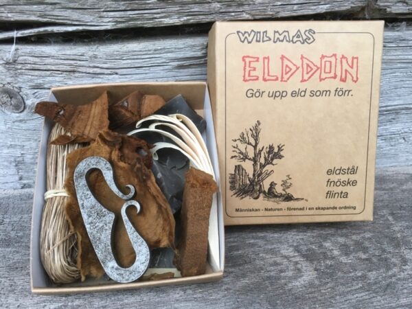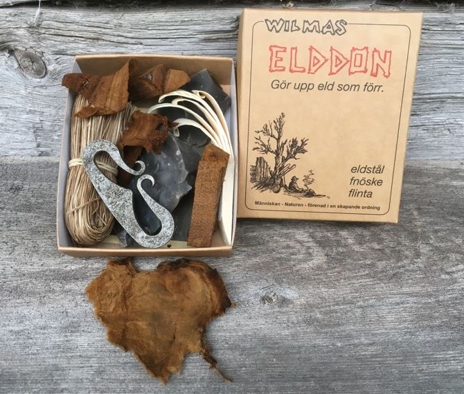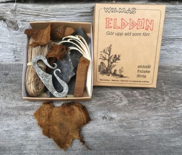 Naast de inhoud van de standaard uitvoering Elddon is er ook een teerhoutstok, en andere natuurlijke tinder / tondel (ontstekingsstoffen) uit de Zweedse bossen.