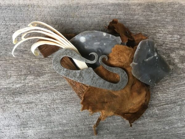 De doos bevat een traditioneel vuurstaal, vuursteen, harshoutstaaf, char cloth en divers natuurlijk ontstekingsmateriaal.
