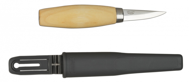 Mora Erik Frost 120 houtsnijmes. Een mes voor het fijnere werk met een lemmet van gelamineerd carbon staal met een kern van 61-62 Rockwell met zachter staal aan de buitenkant. Dit zorgt voor een mes dat lang scherp blijft en gemakkelijk te slijpen is. Het handvat is van geolied berkenhout en geeft een goede greep. Lengte lemmet: 4,9 cm, dikte 2,7 mm.