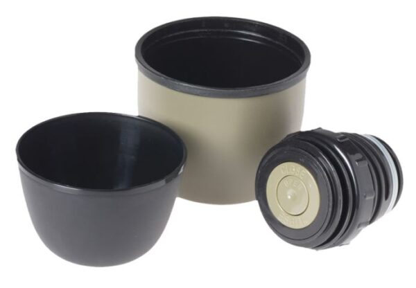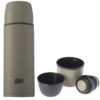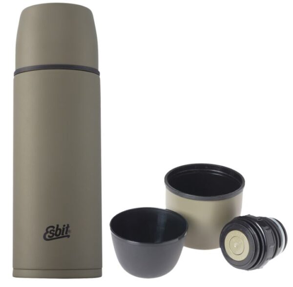 Roestvrij stalen thermosfles van Esbit met khaki kleurige poedercoating. Het houdt warme dranken lang warm en koude dranken koel.