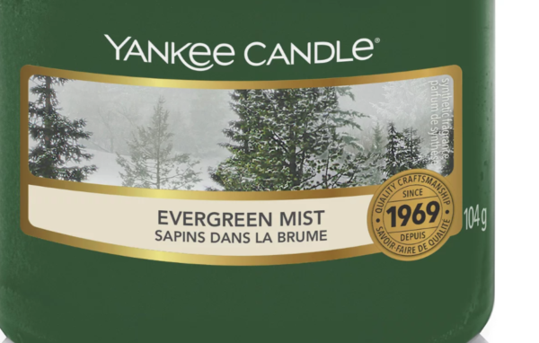 Yankee Candle Evergreen Mist geurkaars in een kleine glazen bewaarpot. Een vredige wandeling door een groenblijvend bos met sneeuwtapijten terwijl de ochtendzon wervelingen van verkwikkende mist creëert.
