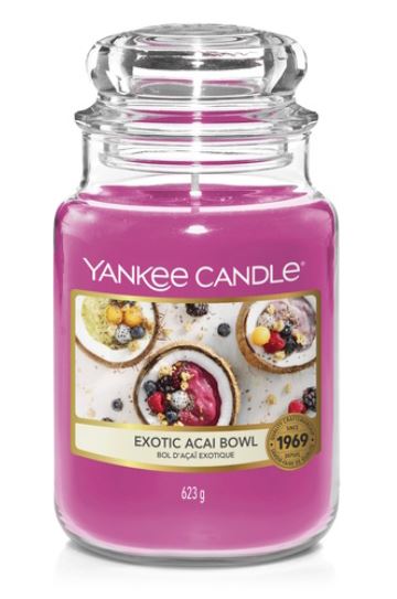 Yankee Candle Exotic Acai Bowl geurkaars in een grote glazen pot. Exotisch fruit verzameld van rond het eiland, van nature zoet en vermengd met tonen van romige kokosnoot met een vleugje roos en jasmijn.