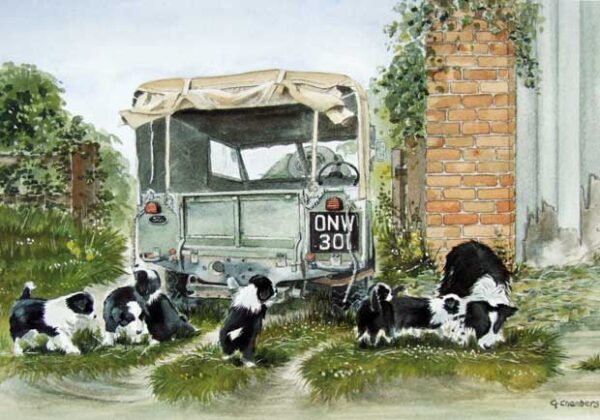 Wenskaart / correspondentiekaart Farmyard Frolics.. Al is het nog zo luk om dolle pret te maken met de andere Border Collies, je moet natuurlijk wel in de buurt van de Landrover blijven, Misschien zit er nog een ritje in…
