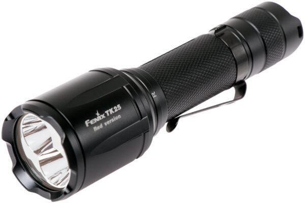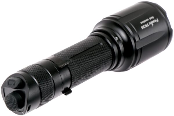 De TK25RB is de meest compacte en veelzijdige jachtlamp van Fenix. De lamp haalt zijn brede inzetbaarheid uit de gepatenteerde draaibare lampkop waardoor je steeds 2 van de 4 leds kunt kiezen. Zo heb je op het ene moment de beschikking over een volwaardige tactische lamp met directe stroboscoop en vier standen wit licht en heb je, na het draaien van de lampkop, de beschikking over krachtig rood en blauw licht. Het rode licht van maximaal 150 lumen stelt je in staat om niet door dieren gezien te worden in het donker terwijl het blauwe licht met 60 lumen goed bloedsporen weergeeft voor het nazoeken. De tactische schakelaar heeft 2 knoppen die doeltreffende bediening toelaten. Gemonteerd op een wapen is de TK25RB met de afstandsschakelaar AER-03 volledig te bedienen.