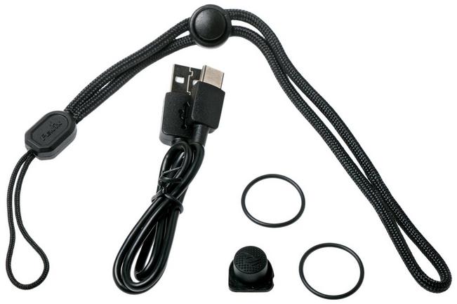 – Geleverd met: foedraal, polskoord, reserve O-ring, reserve rubber schakelaardopje, usb-kabel, gebruikershandleiding, 1x 18650-accu