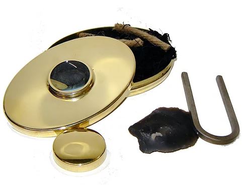 Messing tondeldoos, compleet met inhoud. De tondeldoos heeft een 6x vergrotende lens gemonteerd in het deksel, en is volkomen identiek aan een model dat 250 jaar geleden veelvuldig werd gebruikt door de legendarische mountain men en trappers in Noord-Amerika. Inhoud: jute, char cloth (houtskooldoek), vuursteen en een stalen striker.