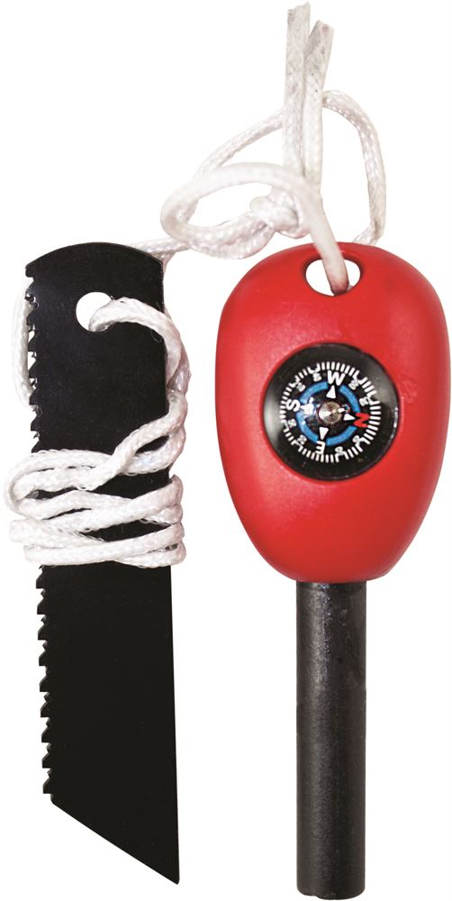 Een effectieve en alternatiefve vuurstarter voor als de lucifers doorweekt zijn (Wet van Murphy), compleet met een met vloeistof gevuld kompas voor noodnavigatie.