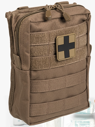 MOLLE EHBO tas van Oxford polyester, gecoat met polyvinylchloride. Kan aan een riem, koppel, en elk MOLLE platform (tas, rugzak) bevestigd worden. Uitgebreide inhoud.