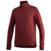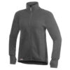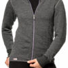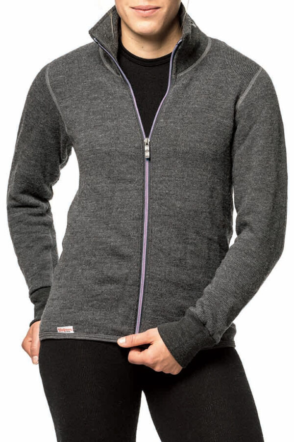 Full zip jacket has a high, double thick collar as well as cuffs with thumb holes. The back is longer to prevent gaps, and the collar has the Woolpower logo knitted in.