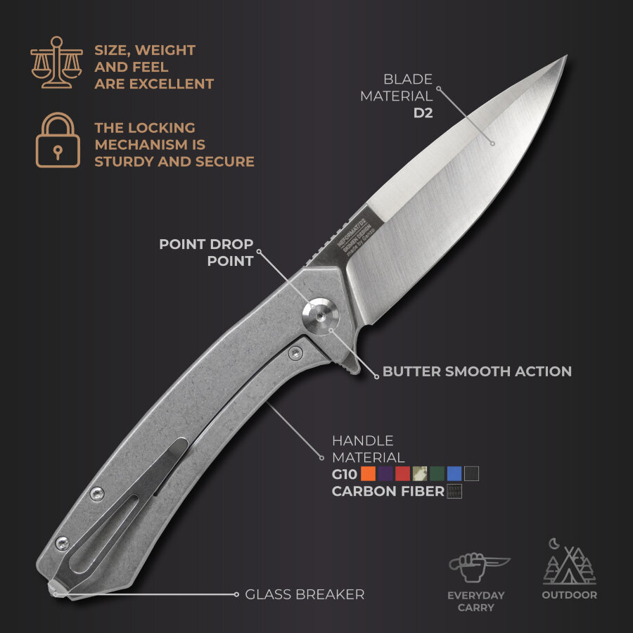 Het model weegt slechts 120 gram. Dit is een lichtgewicht en compact mes. Voor comfortabel dragen kun je hem aan je zak of riem bevestigen; Hiervoor is een metalen clip beschikbaar.