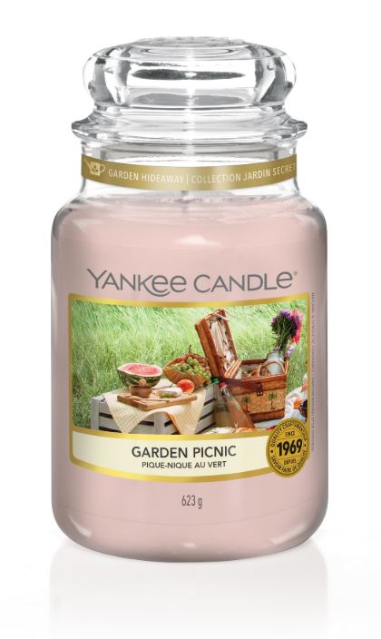 Yankee Candle Garden Picnic geurkaars in een grote glazen pot. Neem je deken en een mand met het rijpste, sappigste fruit mee voor een zonnige picknick tussen de bloemen.