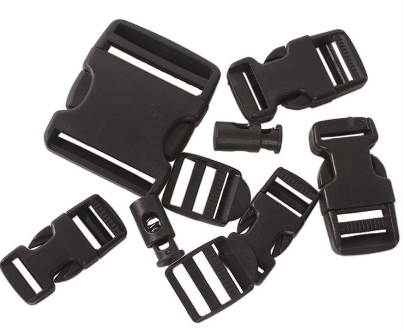 Negen-delige gespen set. Bestaat uit steekgespen , laddergespen en cord-locks.