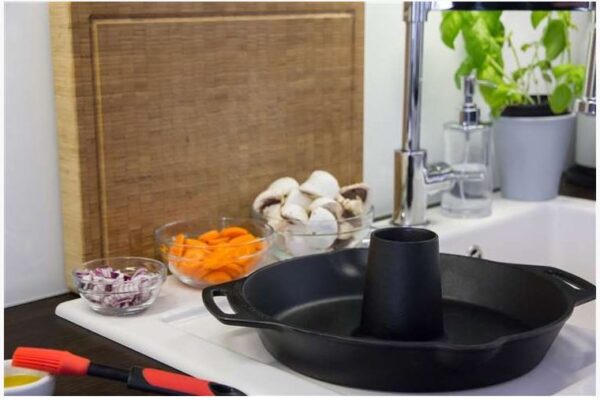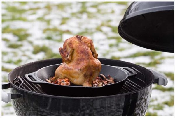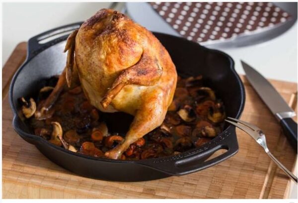 Petromax Poultry Roaster, oftewel gevogelte braadpan. Gemaakt van het beste materiaal om mee te braden: gietijzer. Een gans of kalkoen past er niet in, maar voor een kip, eend en dergelijke is de cf30 ideaal. De werking doet denken aan de z.g. wonderpan. Dit zorgt er voor dat het gevogelte gelijkmatig bereid wordt, van buiten knapperig en van binnen lekker sappig.