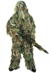 Kant-en-klare Ghillie Suit bestaande uit jack, broek, hoofdbedekking en geweercamo, alles in een tas. Gemaakt met 23cm lang jute. Brandvertragend geimpregneerd.