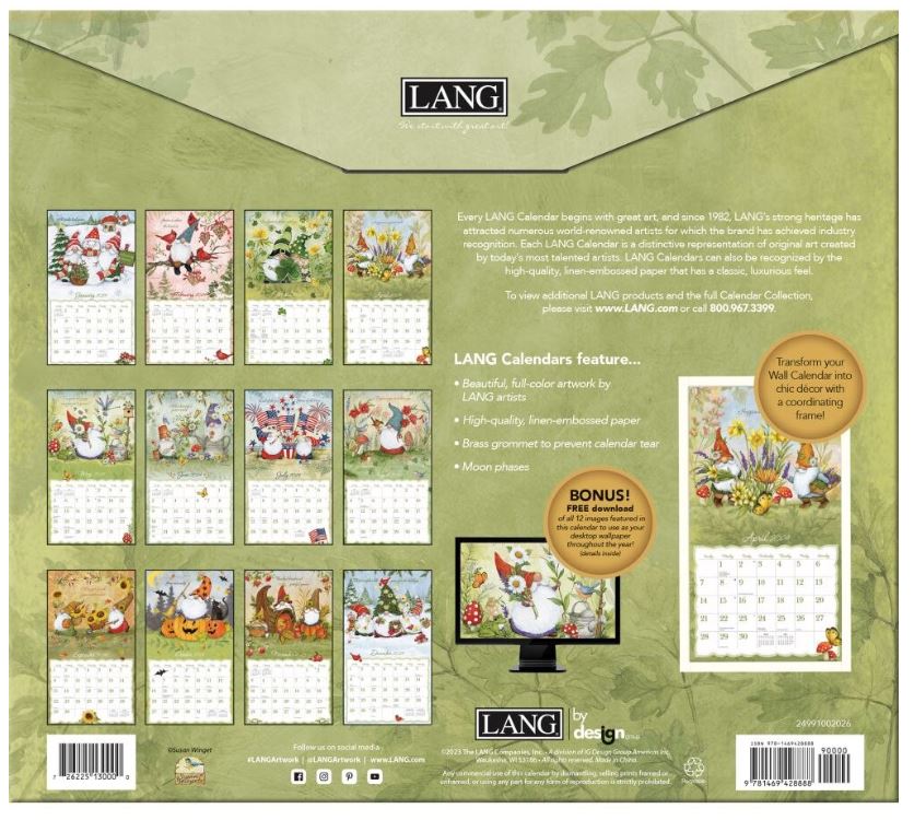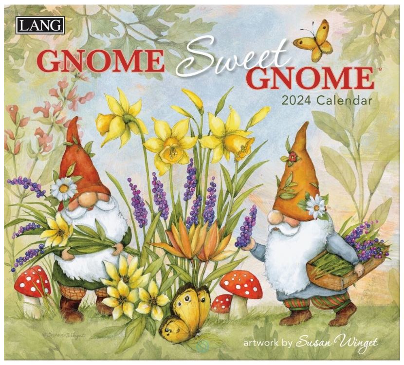 Dagelijkse planning ontmoet prachtige kunst in de Gnome Sweet Gnome 2024 Wandkalender, met kunstwerken van Susan Winget.