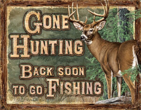 Metalen bord Gone Hunting, Back Soon to Go Fishing. Ben zo terug van het jagen om te gaan vissen.