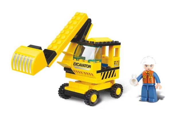 Sluban bouwdoos van een graafmachine. Inhoud: 62 stukjes en 1 poppetje.