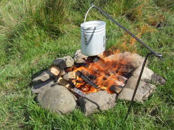 Set van twee pinnen die in elkaar gestoken worden. De ene prikt u in de grond, aan de andere kunt u een billycan of ketel boven een houtvuur hangen. Wordt geleverd met een fraaie handgemaakte leren hoes.