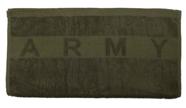 Badstoffen handdoek met ingeweven “ARMY”. – 100% Katoen. – Afmeting: 100 X 50 cm. – Kleur: groen.