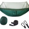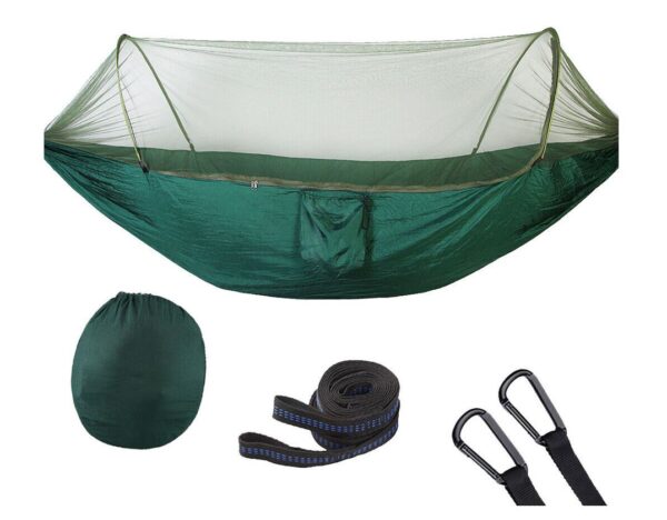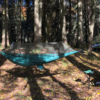 Zeer lichte hangmat van scheurvast nylon en met een geïntegreerd pop-up muskietennet.