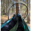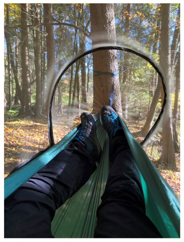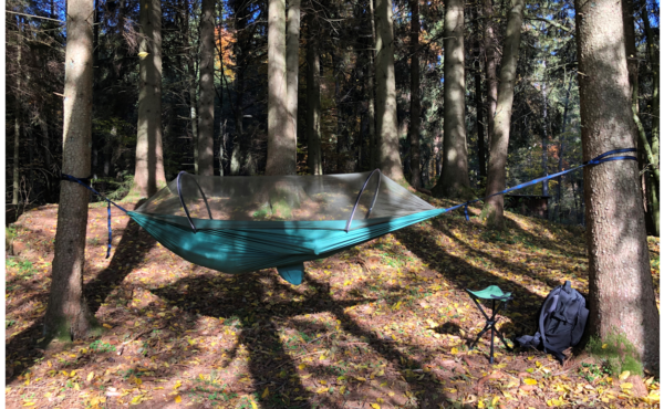 Het muskietennet spant zonder ophanging en maakt een combinatie die perfect is om buiten mee te overnachten.