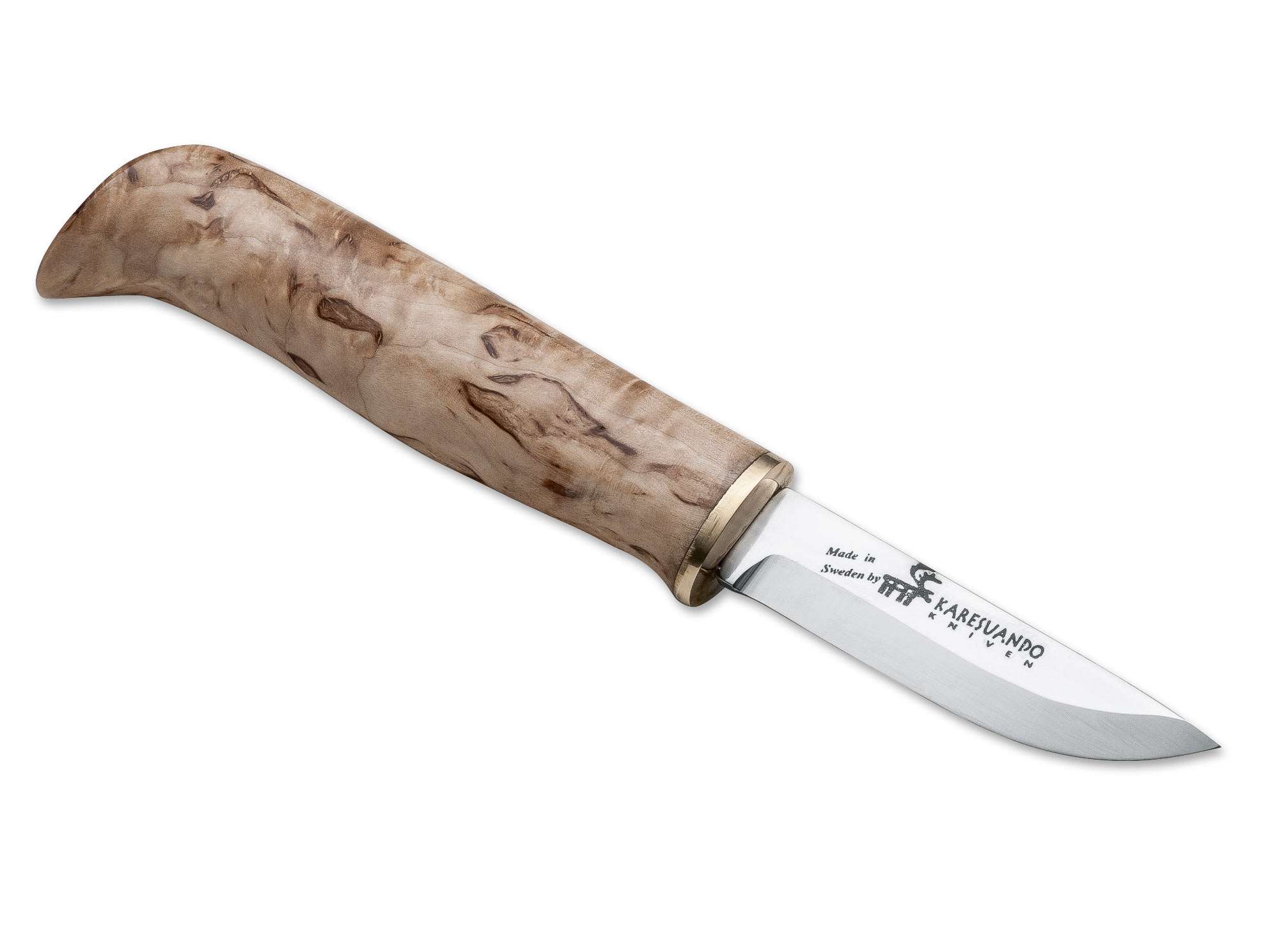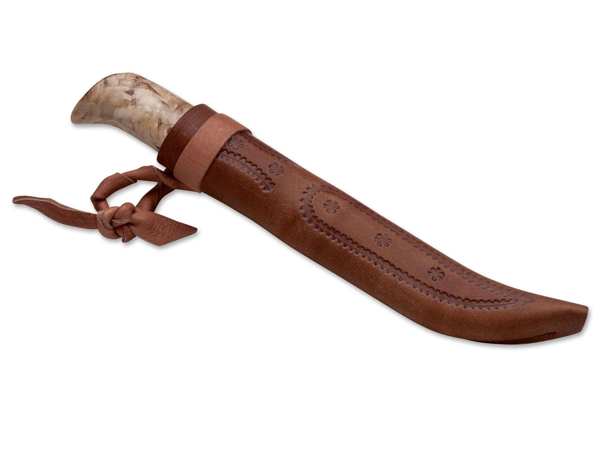 The Haren (“Hare”) is a classic Finnish knife in traditional proportions, which provide fully capable grip even on a compact knife. The grip with small finger grooves and brass pommel is fabricated from oiled, grained birch, and provides reliable handling due to its wide pommel. Traditional leather sheath following Sami tradition with leather straps (no belt loop), including decorative embossment and plastic insert. 12C27 blade steel.