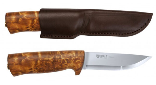 Helle Eggen Bushcraft Survival Knife. Mooi Scandinavisch bushcraft mes. Het lemet is gemaakt van 3-lagen RVS, 58-59 Rockwell. Berkenhouten greep. Komt met stevige leren schede.