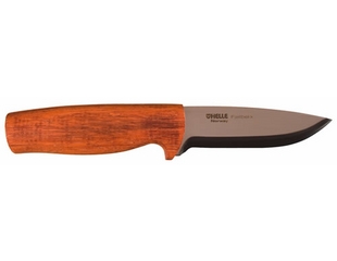 Helle Fjellbekk. De messen van Helle Knives zijn ontworpen voor stevig gebruik. De Fjellbekk is gemaakt van drievoudig gelamineerd RVS en heeft een merbau houten handgreep. Komt met een stevige leren schede.