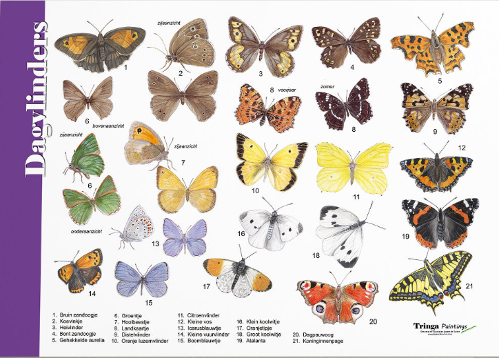 Op de herkenningskaart / zoekkaart Vlinders staan de meest voorkomende dagvlinders afgebeeld. Leer soorten als dagpauwoog, kleine vos, atalanta, citroentje en koolwitje snel op naam te brengen. Op de achterzijde van de kaart vind je informatie over de vliegtijden van de vlinders.