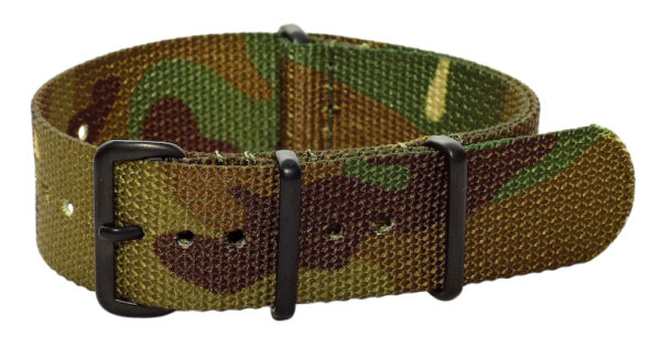 Horlogeband in woodland camouflagepatroon met metalen gespsluiting. Van een sterk kunststof materiaal. Neemt geen vocht op en rot niet.