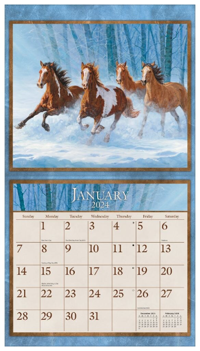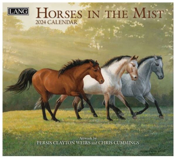 De Horses in the Mist 2024 wandkalender is versierd met maandelijkse kunstwerken van Persis Clayton Weirs en Chris Cummings van majestueuze paarden in het wild.