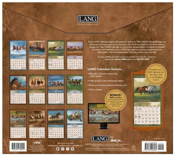 LANG wandkalenders zijn voorzien van maandelijkse kleurenafbeeldingen, elegant linnen reliëfpapier en een messing ring om op te hangen.