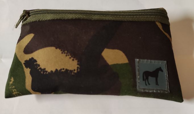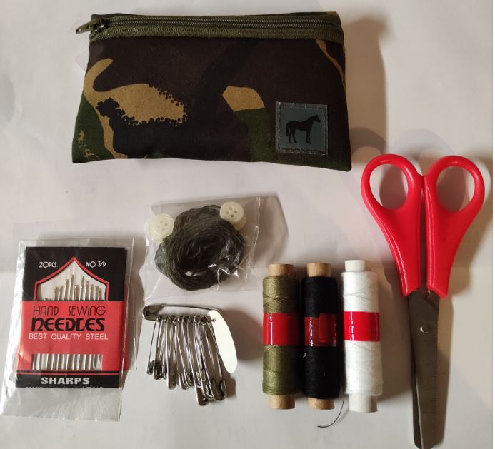 Tasje in KL-woodland camo met diverse benodigdheden om kleding te herstellen: