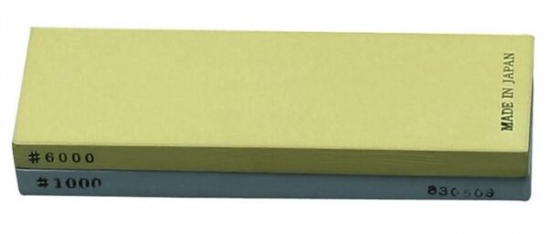 De gele steenzijde heeft een bijzonder fijne korrel 6000, wat ideaal is voor de finishing touch en het zeer scherp maken.