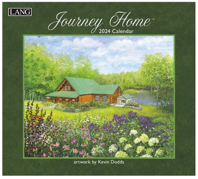 De wandkalender Journey Home 2024 is versierd met maandelijkse kunstwerken van Kevin Dodds die huizen op verschillende locaties uitbeelden.
