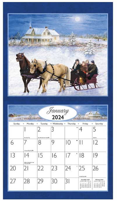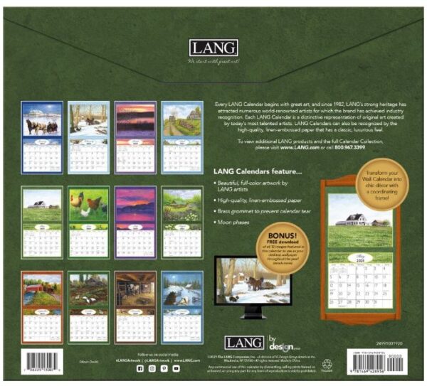 LANG wandkalenders zijn voorzien van maandelijkse kleurenafbeeldingen, elegant linnen reliëfpapier en een messing ring om op te hangen.