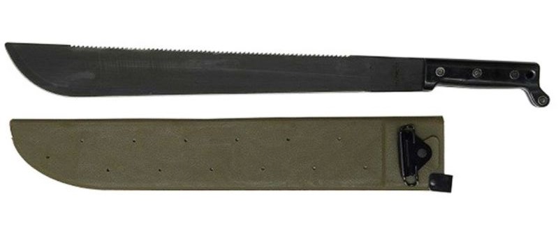 Machete met harde kunststof schede. Bovenkant van het lemmet heeft zaagvertanding. – Gewicht: 800g – Lengte: plm. 47 cm – Bevestiging aan een koppel met oogjes